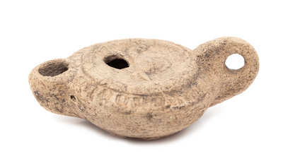 A Roman Style Terracotta Oil Lamp Length 3 1/2 inches.