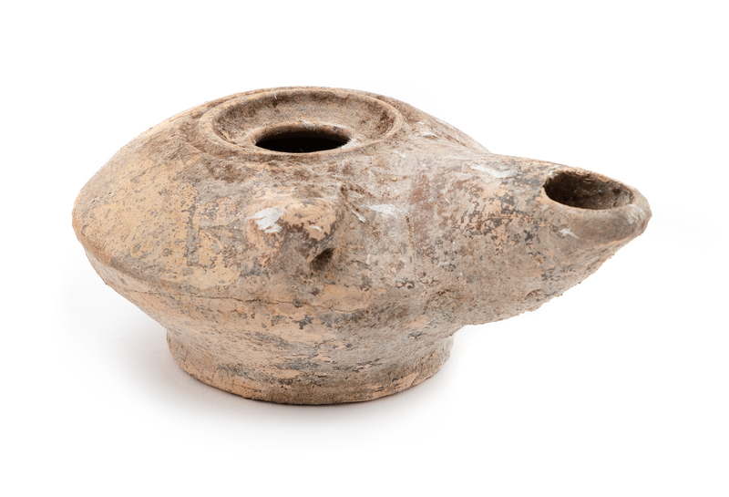 A Roman Terra Cotta Oil Lamp Height 2 x diameter 4 1/2 inches.