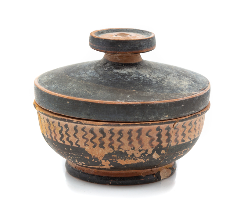 A Greek Pottery Lidded Bowl Diameter 3 inches.