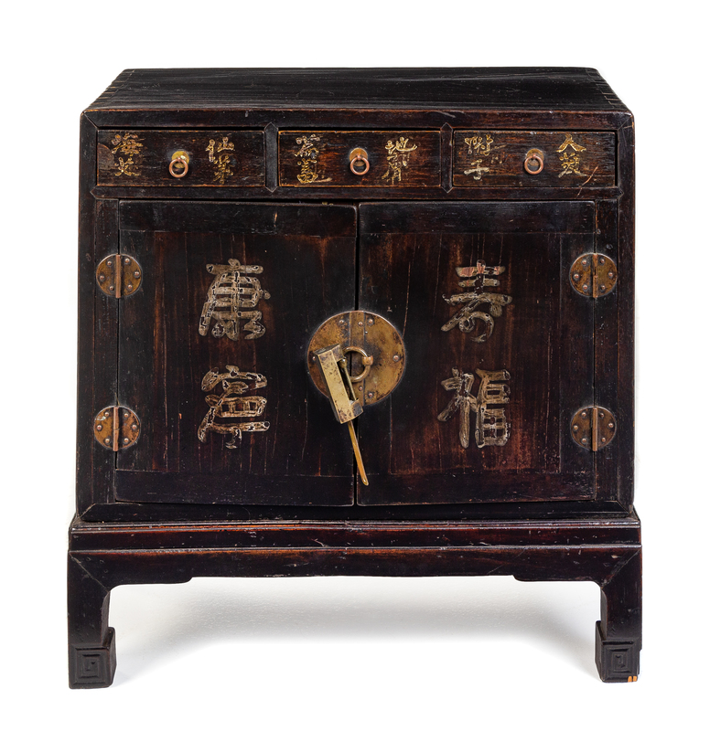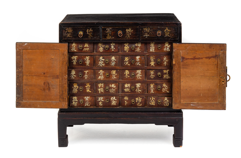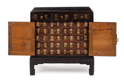 A Chinese Lacquered Apothecary Cabinet Height 21 3/4 x width 21 x depth 10 1/2 inches.