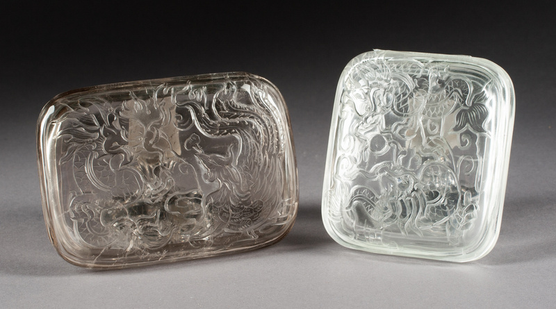 Two Chinese Carved Rock Crystal Boxes Width of wider 4 1/4 inches.