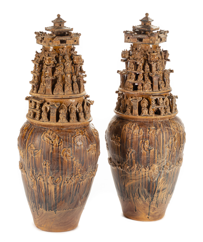 A Pair of Chinese Terra Cotta Covered Urns Height 44 inches.