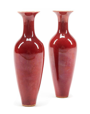 A Pair of Sang de Boeuf Porcelain Vases Height 9 1/2 inches.