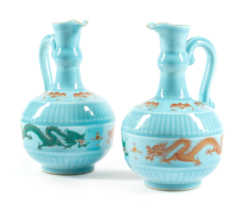 A Pair of Chinese Porcelain Ewers Height 10 1/2 inches.