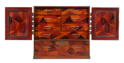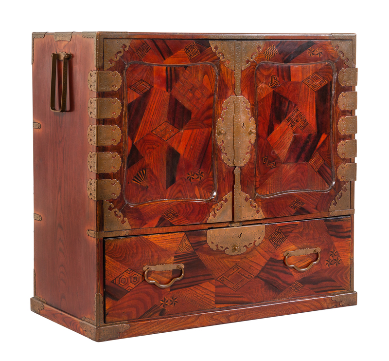 A Brass Mounted Marquetry Tansu Chest Height 33 x width 35 x depth 16 1/4 inches.