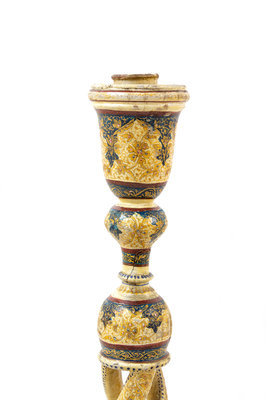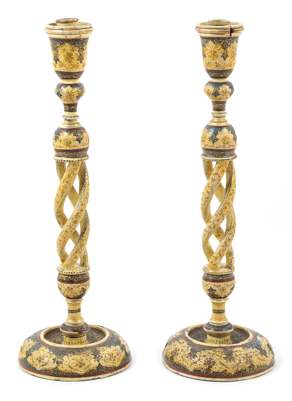 A Pair of Kashmiri Papier-Mache and Lacquer Candlesticks Height 19 1/2 inches.