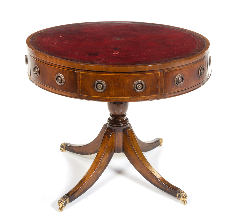 A Regency Style Mahogany Drum Table Height 29 x diameter of top 36 1/2 inches.