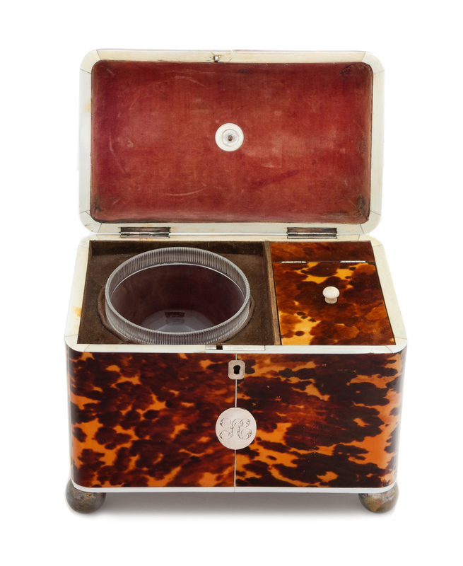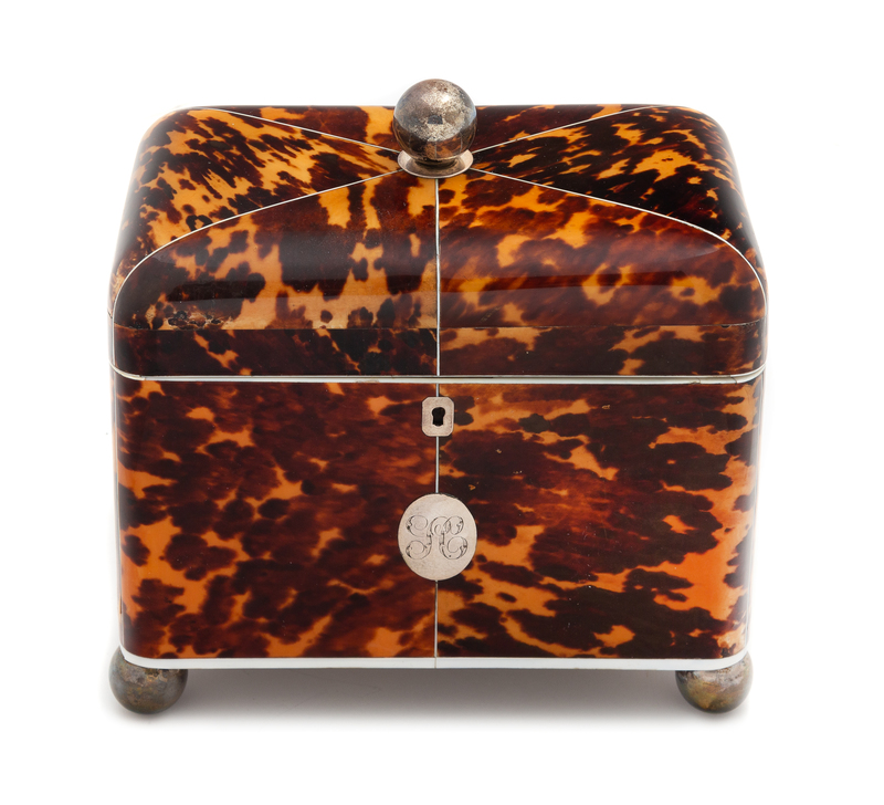 An English Silver Inlaid Tortoise Shell Tea Caddy Height 8 1/2 x width 8 x depth 4 3/4 inches.