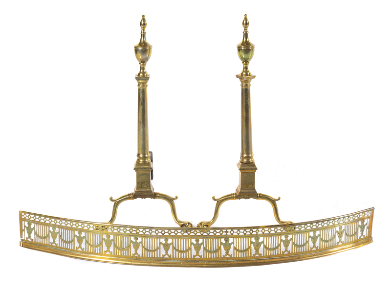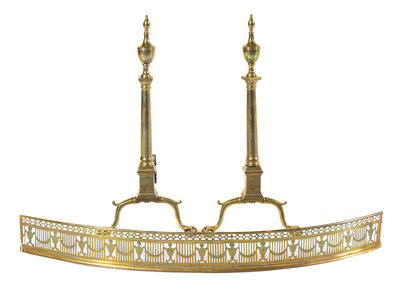 A Pair of Colonial Style Brass Andirons and an Associated Brass Fender Height of andirons 29 1/2 inches.