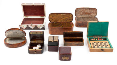 comprising four burlwood snuff boxes; a mother-of-pearl inlaid box containing a miniature porcelain dog; a tortoise shell and mother-of-pearl veneered box; a leather-cased set of miniature playing cards and a cased miniature gaming set; 8 items total.