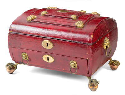 An English Leather Veneered Jewelry Box Height 7 1/2 x width 10 1/2 x depth 8 inches.