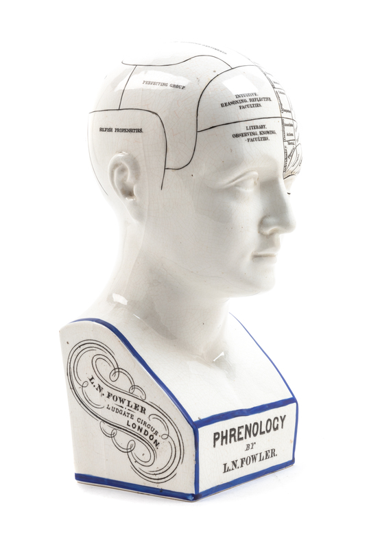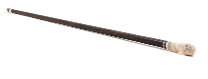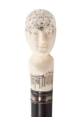 together with a walking stick having a carved handle decorated in the form of a phrenology bust.