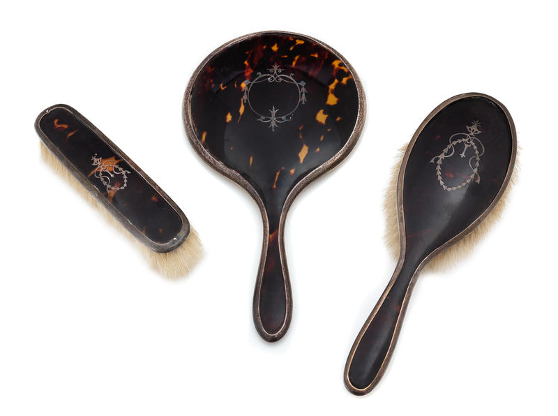 An English Silver and Tortoise Shell Three-Piece Dresser Set, G. W. Lewis & Co., Birmingham, 1919-25, comprising two brushes and a hand
