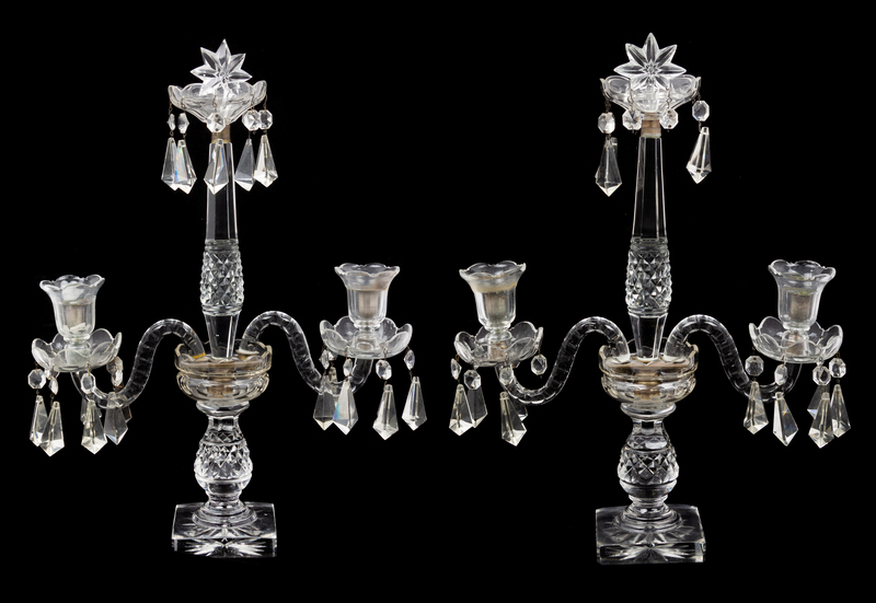 A Pair of English Cut Glass Two-Light Candelabra Height 19 1/2 inches.