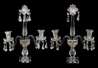 each of baluster form with a star-form finial and S-scroll candle arms, hung with prisms throughout.