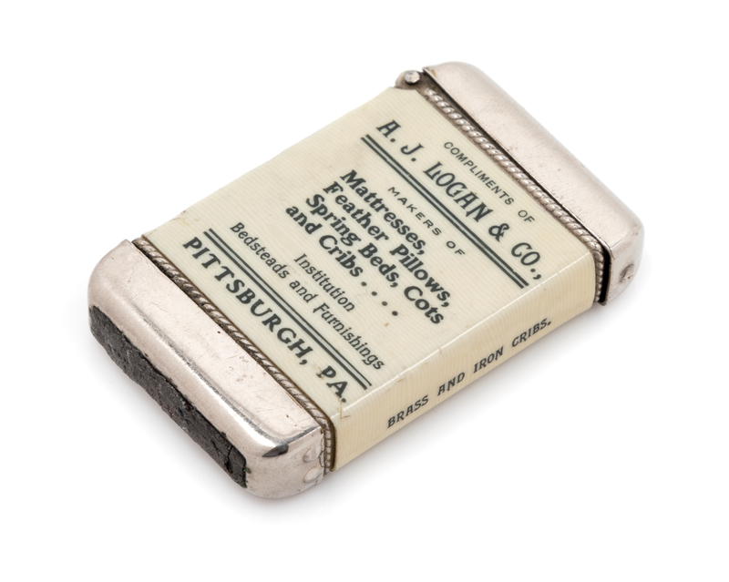 one side marked Compliments of A.J. Logan & Co. Makers of Mattresses, Feather Pillows, Spring Beds, Cots and Cribs....Institution Bedsteads and Furnishings Pittsburgh, PA, the reverse with a polychrome portrait of a lady.