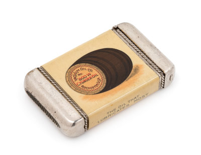 one side decorated with a polychrome barrel labeled Arctic Engine Oil-Vacuum Oil Co. Rochester USA, the reverse with a similar barrel labeled 600-W Cylinder Oil-Vacuum Oil Co. Rochester USA.