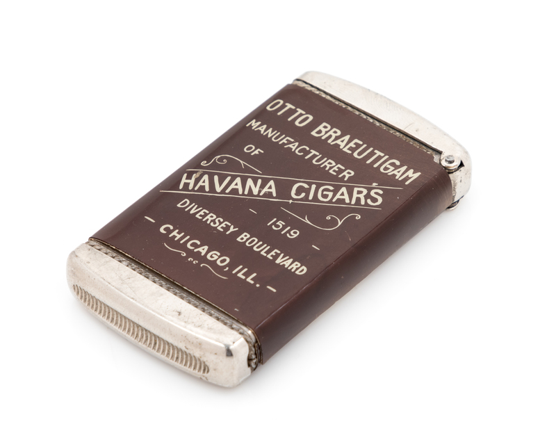 one side decorated with an advertisement for Otto Braeutigam Manufacturer of Havana Cigars 1519 Diversey Boulevard Chicago, ILL., the reverse with a portrait photograph.