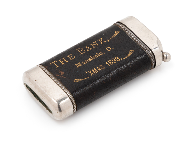 the leather-wrapped body with embossed inscription The Bank, Mansfield, O. 'XMAS 1898.