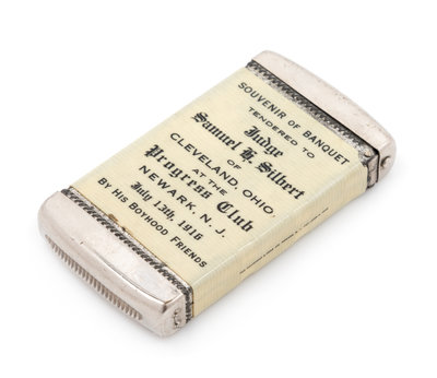 one side marked Souvenir of Banquet Tendered to Judge Samuel H. Silbert of Cleveland, Ohio at the Progress Club Newark, NJ July 13th, 1916 By His Boyhood Friends, the reverse with a collage of photographs.