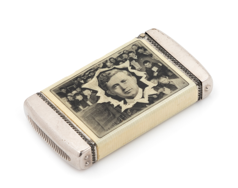An American Celluloid and Mixed Metal Commemorative Match Safe Height 2 7/8 inches.