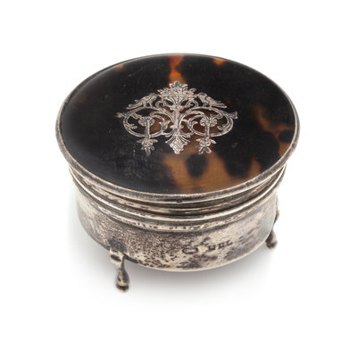 An Engish Tortoise Shell Mounted Silver Snuff Box, Maker's Mark Obscured, London, 1918, the circular tortoise shell lid centered with a