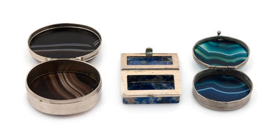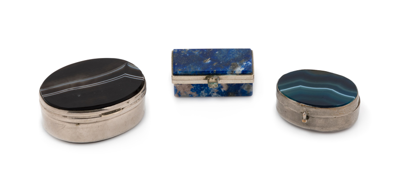 A Group of Three Hardstone Mounted Snuff Boxes, Late 19th/Early 20th Century, comprising two examples with agate inset lids and bases a