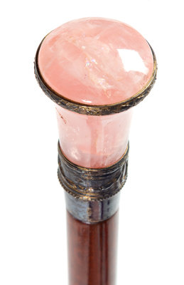 the carved rose quartz handle with a silver band above the mahogany shaft ending in a horn ferrule.