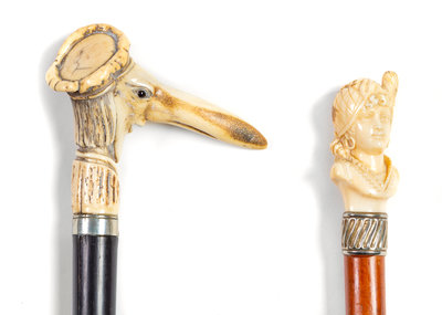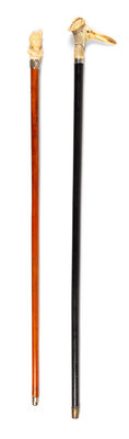 Two Continental Carved Figural Walking Sticks Length of longer 36 inches.