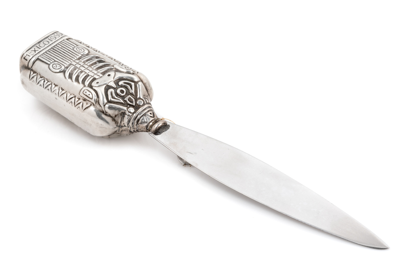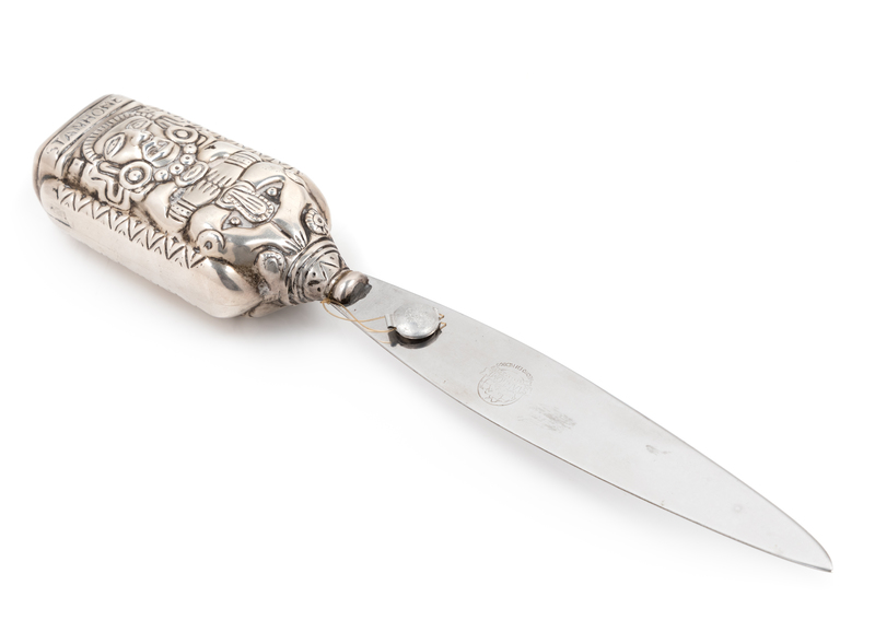 A Mexican Silver Paper Knife, Margot van Voorhies Carr, Taxco, Mid-20th Century, the handle worked with an Aztec deity, the reverse ins