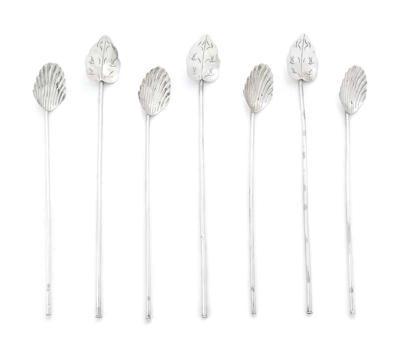 Twenty-Four Mexican Silver Iced Tea Spoons, 20th Century, comprising a set of 12 with scallop-form bowls and another set of 12 with fol