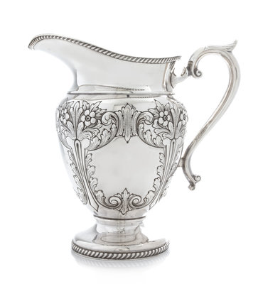 An American Silver Water Pitcher, Durham Silver Co., New York, NY, Mid-20th Century, of baluster form with a gadroon neck and foot rim,