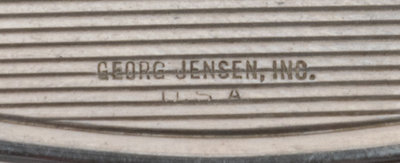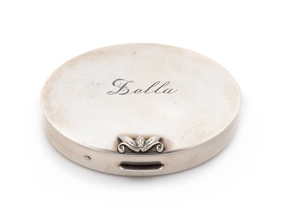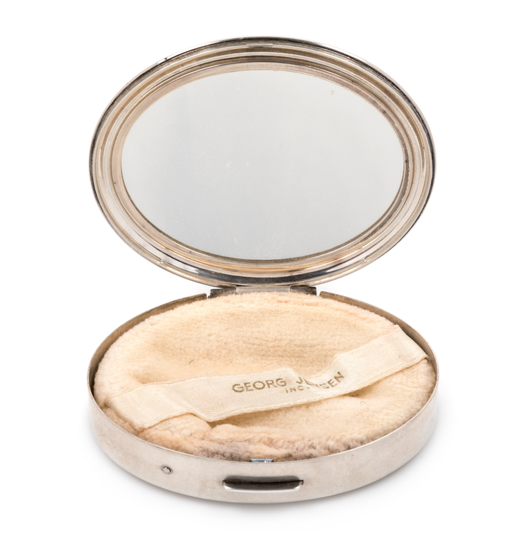 An American Silver Compact, Georg Jensen Inc., New York, NY, Circa 1940, or oval form, the lid with an engraved name and applied foliat