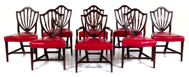 comprising one armchair and seven side chairs, each having a shield form back above a stuffover seat, raised on square tapering legs joined by a box stretcher.