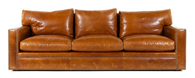 A Custom Leather-Upholstered Three-Seat Sofa Height 35 x width 108 x depth 40 inches.