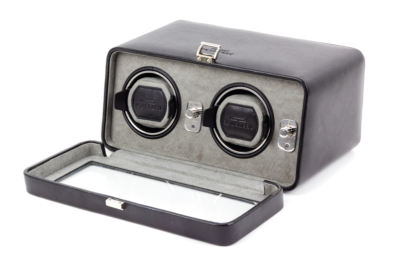 A Wolf Dual Operation Watch Winder Height of case 8 x width 11 1/2 x depth 5 1/2 inches.