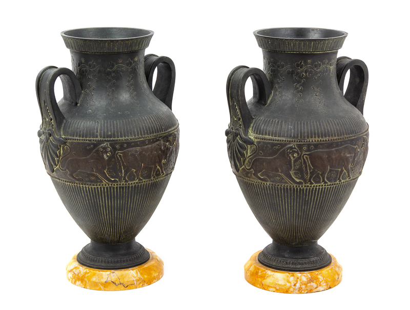 A Pair of Neoclassical Cast Metal Urns Height 15 3/4 inches.