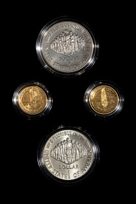 comprising a $5 gold proof, $5 gold coin, $1 silver proof and $1 silver coin, with a Certificate of Authenticity, Display box and US Mint outer box.