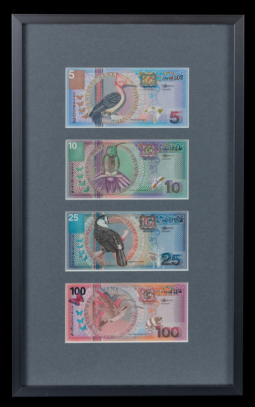 A Framed Group of Four Suriname Series 2000 Bank Notes