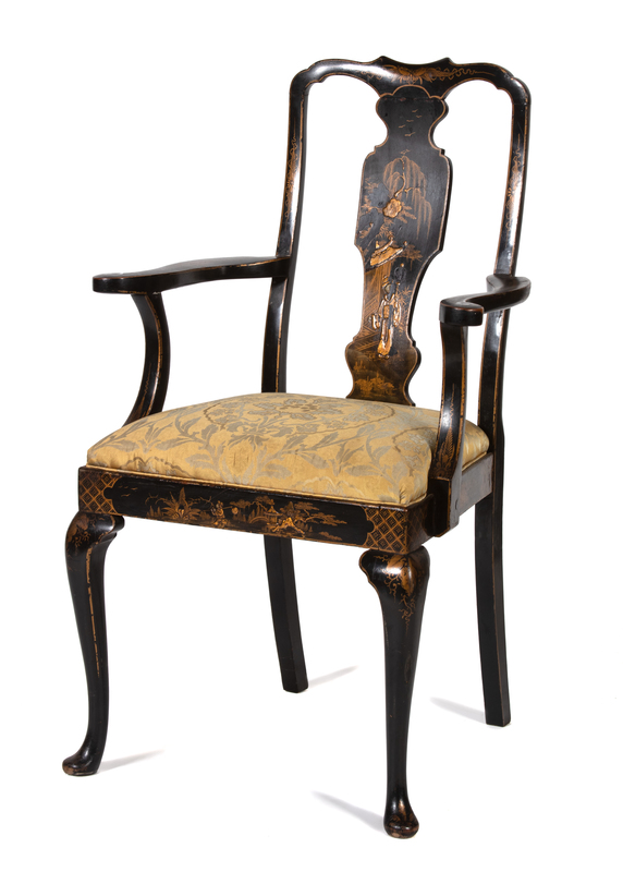 A Queen Anne Style Black and Gilt Lacquer Chinoiserie Decorated Open Armchair