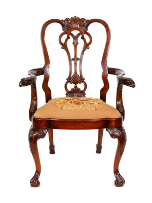 with carved eagle head knuckles; needle work seat of armorial design.