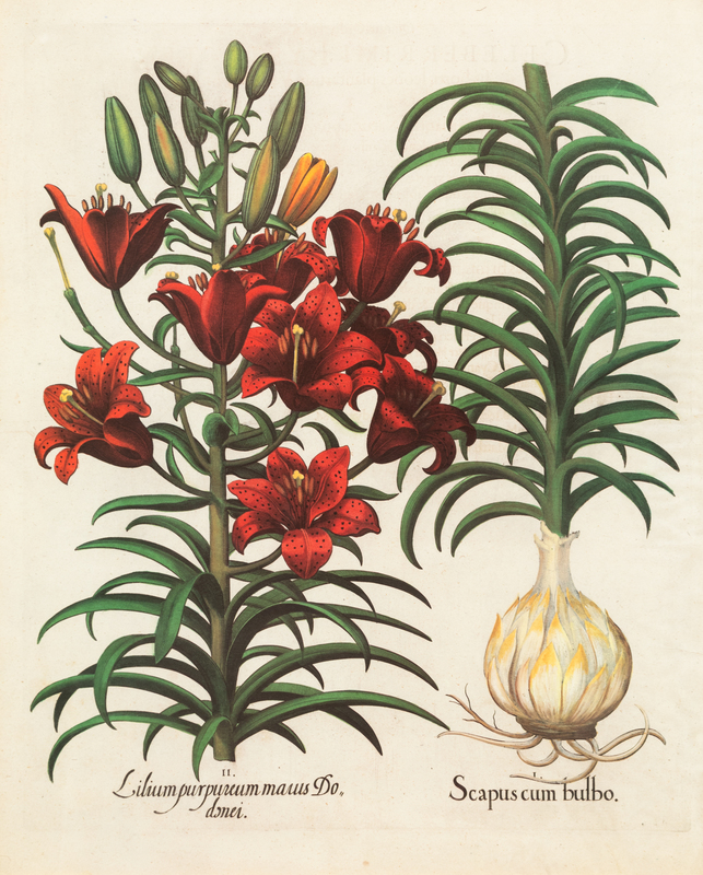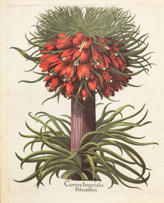 one depicting Corona Imperialis Polyanthos; the other Lilium purpureum marus Dodonei/Scapus cum bulbo, gilt and ebonized wood frame.