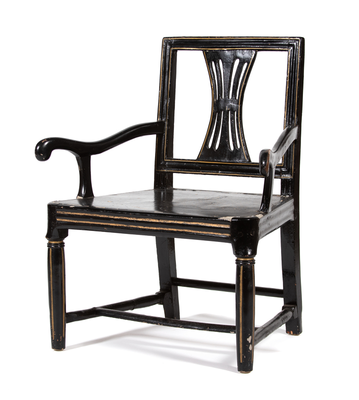A Regency Style Ebonized and Parcel Gilt Open Armchair