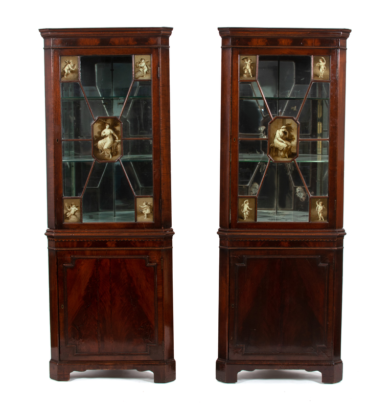 the upper section having mullioned glazed doors with sepia painted panels; the lower section with cabinet doors.