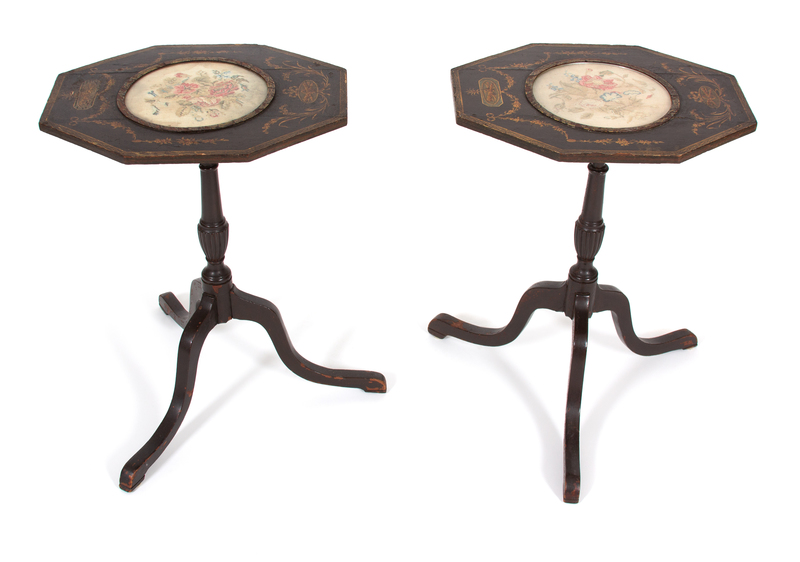 A Pair of Regency Ebonized and Gilt Pole Screens Converted to Tilt-top Tables