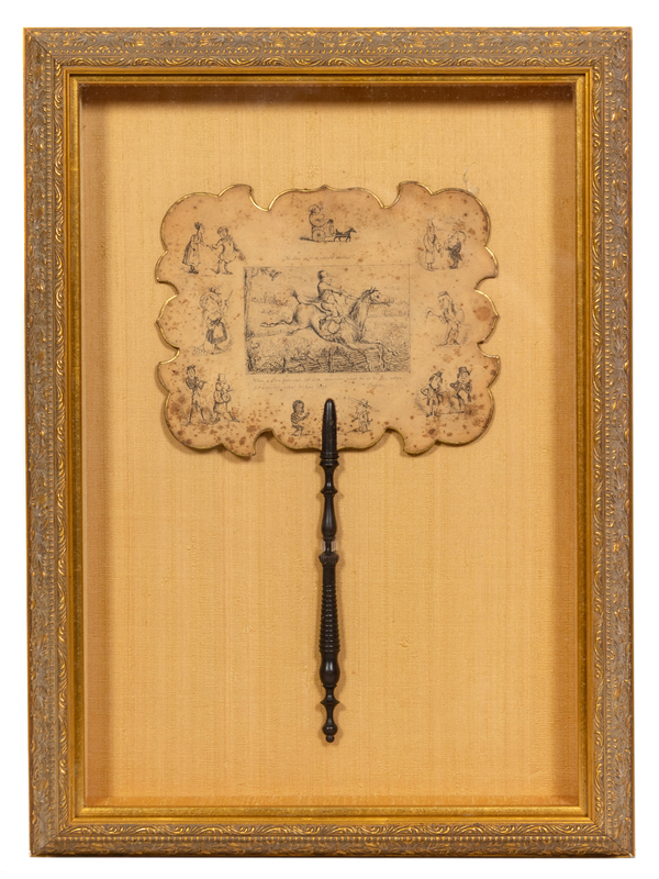with beige ground and decorated with whimsical caricatures likely after George Cruikshank, with turned and ebonized handles.