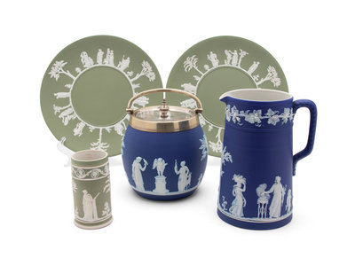comprising a pair of white on green plates, a white on green spill vase, a white on blue ewer and a white on blue biscuit barrel.