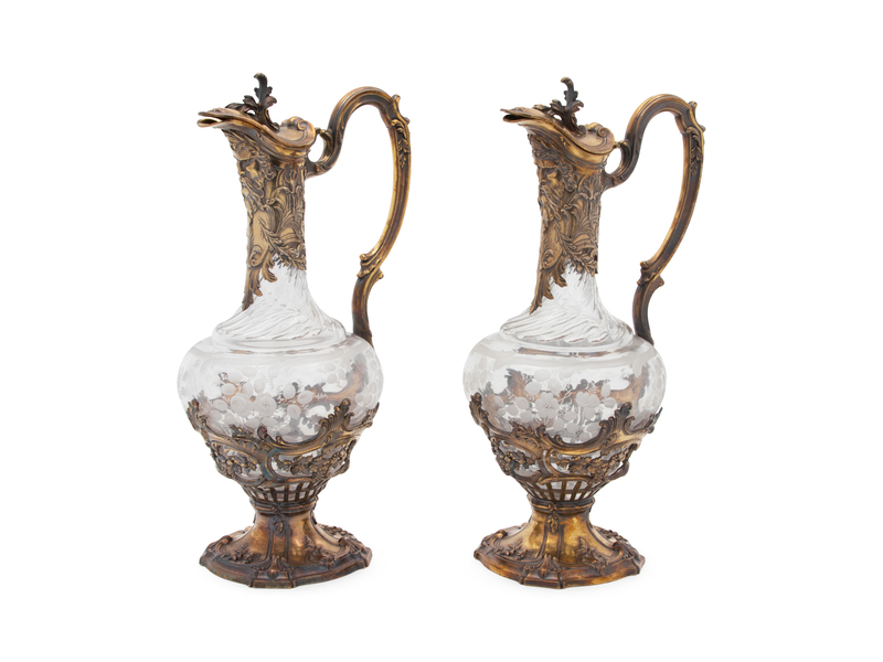 A Pair of French Etched Glass and Vermeil Mounted Ewers