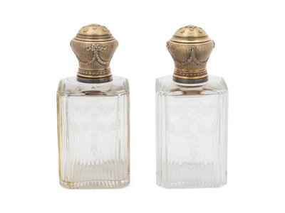 A Pair of French Etched Glass and Vermeil Topped Decanters
