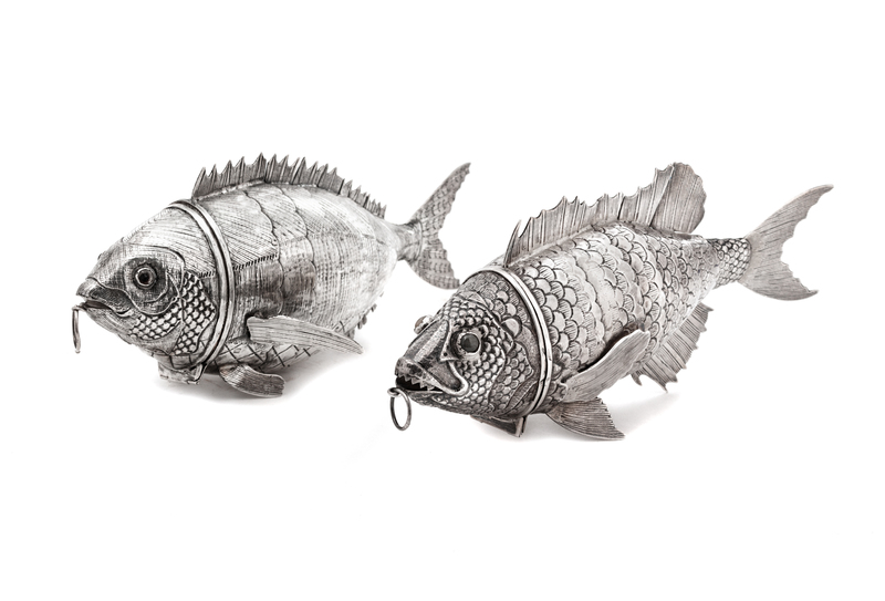 A Pair of Continental Silver and Silverplate Fish-Form Spice Boxes